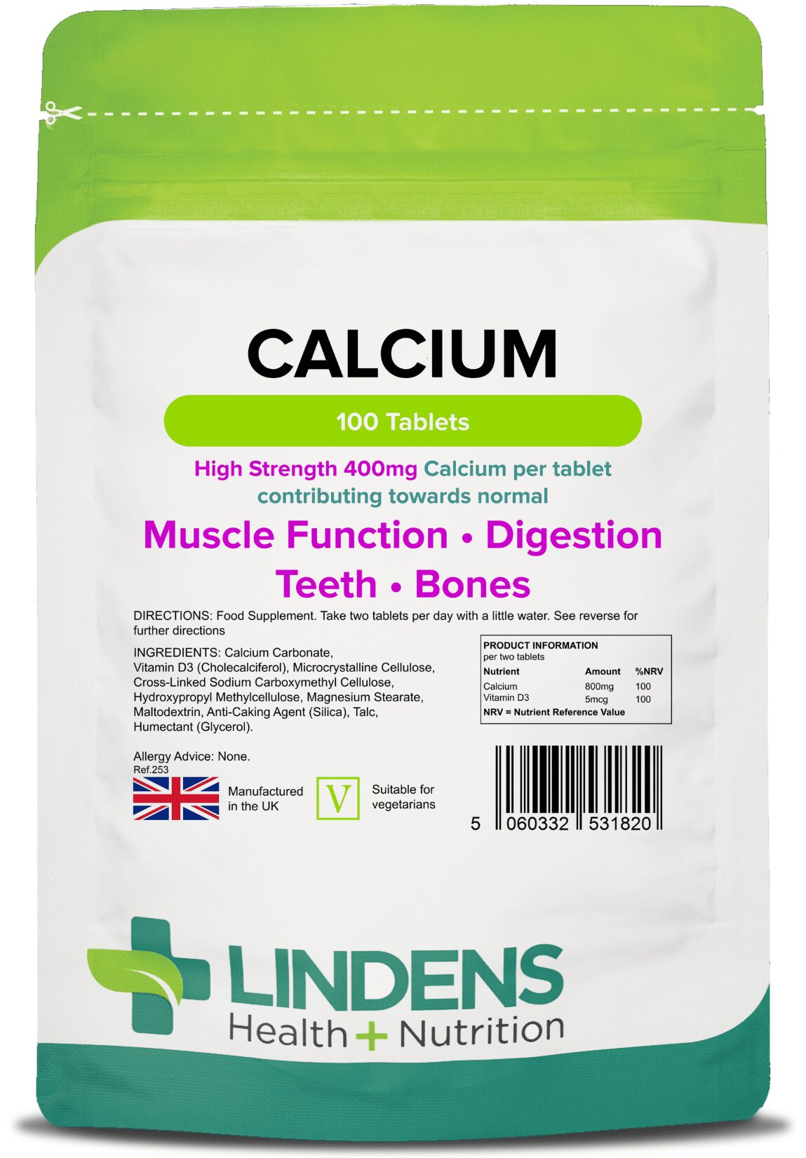 INGREDIENTS: Calcium Carbonate, Cholecalciferol, Microcrystalline Cellulose, Cross-Linked Sodium Carboxymethyl Cellulose, Hydroxypropyl Methylcellulose, Magnesium Stearate, Maltodextrin, Anti-Caking Agent (Silica), Talc, Humectant (Glycerol).